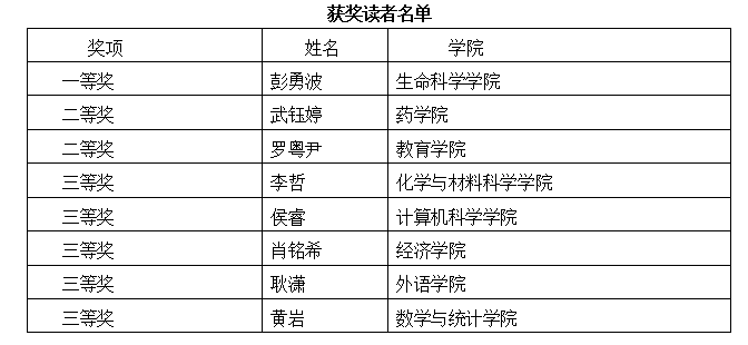 为感谢师生对活动的大力支持,图书馆从参与此次活动的师生中随机抽取了8名获奖读者(获奖名单如下),并赠送了小礼品。希望全校师生继续关注、支持图书馆的各项活动。