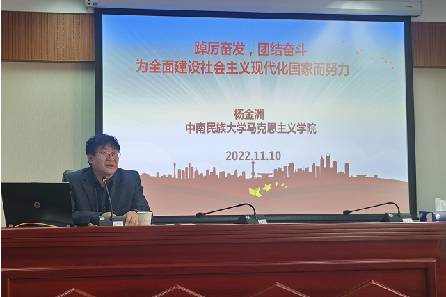 杨金洲围绕“踔厉奋发,团结奋斗,为全面建设社会主义现代化国家而努力”主题,从党的二十大召开的伟大意义和会议主题,牢牢把握过去五年工作和新时代十年伟大变革的重大意义,牢牢把握新时代中国特色社会主义思想的世界观和方法论,牢牢把握以中国式现代化全面推进中华民族伟大复兴的使命任务,牢牢把握以党的伟大自我革命引领伟大社会革命的重要意义,牢牢把握团结奋斗的时代要求等六个方面对党的二十大精神进行系统宣讲和深入阐释。