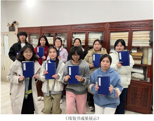 特藏部王敏老师为同学们演示了线装书装订之前的折页、齐栏、打眼、穿纸钉、压平等制作环节。随后,同学们在老师手把手的指导下打孔、上纸钉、系结、订线、贴书签,逐步完成了线装书的装订流程,亲手创做出属于自己的独一无二的作品。