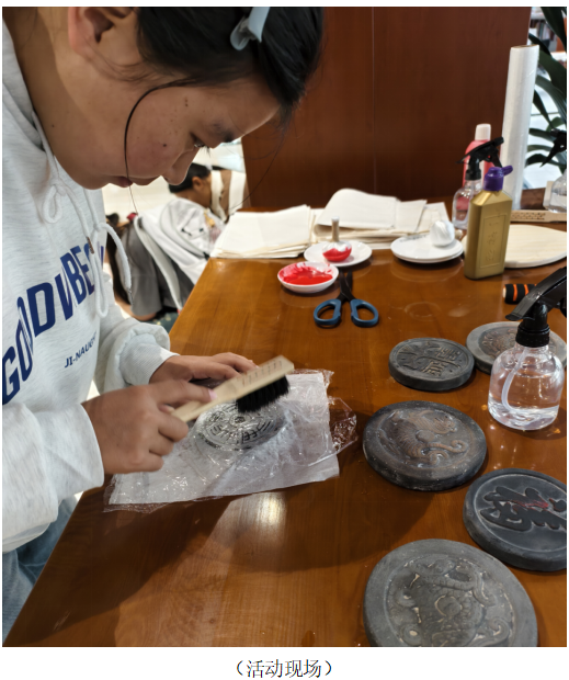 “拓片技艺是古籍文献传承的重要方式,很多散佚的古籍,正是通过拓片得以保存,这对学术研究至关重要。”同学们按照步骤,先将薄如蝉翼的宣纸覆盖在复刻碑刻上,用软毛刷轻轻抚平,确保宣纸与碑刻纹路完全贴合,再用蘸取少量墨汁的拓包,以“轻拍慢打”的方式均匀施墨。