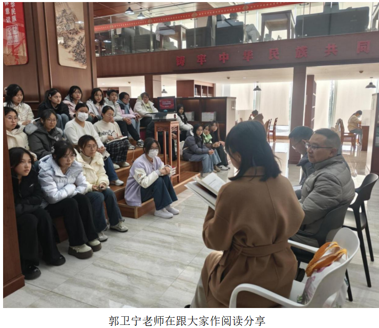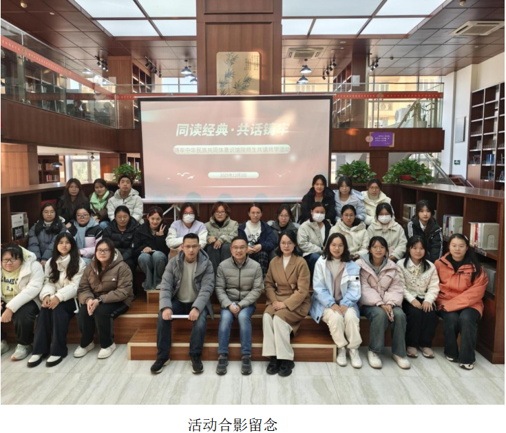 2025年12月3日下午,图书馆在铸牢中华民族共同体意识阅读空间举办了一场主题鲜明、内容深刻的“同读经典·共话铸牢”馆院共读共学活动。董坤副馆长、读者服务部吴金华主任、郭卫宁老师与管理学院工商2503班的同学们齐聚一堂,围绕铸牢中华民族共同体意识这一主题开展了一次别开生面的经典阅读分享活动。